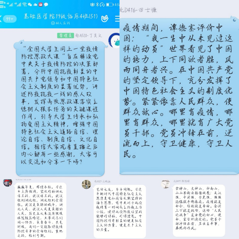 在线直播学习结束后,辅导员、班主任组织班级团支部开展了线上讨论,发表学习感受,进一步强化对思政课讲授内容的理解,真正把思想引领做到位,将教育效果延伸到学生心里。老师们表示,作为学工队伍一员,必须教育青年学生学好硬核的专业知识,为中华民族的发展积蓄成长力量;引领学生用青春奋斗担当历史使命和时代责任,做一个顶天立地的中国青年,走好属于青年人的新长征。同学们也踊跃发言,他们认为:通过学习“疫情防控思政大课”,正确理解了世界与中国、历史与现实、危机与优势;深刻认识到此次抗疫彰显的中国特色社会主义制度显著优势;进一步增强了“四个意识”,坚定了“四个自信”。大家纷纷表示,作为新时代的济医青年,要不忘初心,勇担从医使命,将青春梦想扎根祖国大地,回应时代的召唤,将“小我”融入中华民族伟大复兴的滚滚洪流中,与时代同步伐、与人民共命运。
