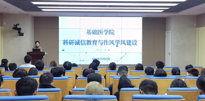 为进一步加强学院科研诚信体系建设,全面规范医学科研行为,10月20日-21日,基础医学院面向全体学生开展科研诚信教育与学风建设活动。基础医学院团总支书记陈林老师主持,基础医学院学生会相关活动负责同学张鑫媛、陈博贤、冯一飞以及马诚骏主讲本次活动。