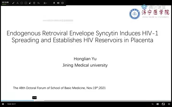 于红莲老师围绕《Endogenous Retroviral Envelope Syncytin Induces HIV-1 Spreading and Establishes HIV Reservoirs inPlacenta》科技文献,对HIV如何感染胚胎组织的分子机制进行了详细地阐述,分别从临床胚胎组织水平及细胞水平,并且从不同的受体和配体角度证实HIV利用胚胎滋养细胞膜蛋白syncytin完成HIV感染CD4阴性细胞的过程,以及再进一步感染深层胚胎组织。另外分享了论文阅读中的一些体会。与会师生就文献中感兴趣的问题与于红莲老师进行了在线交流。