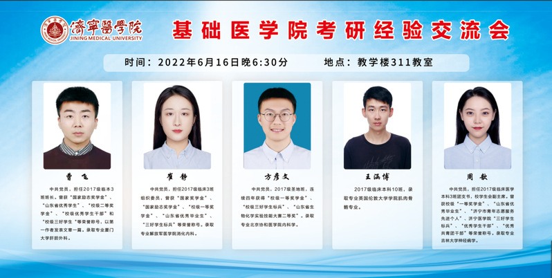 本次活动邀请了2017级临床医学专业的曹飞、崔静、王涵博、周歆、方彦文共五位同学,他们均在今年的研究生考试中取得优秀成绩,考上了理想院校。